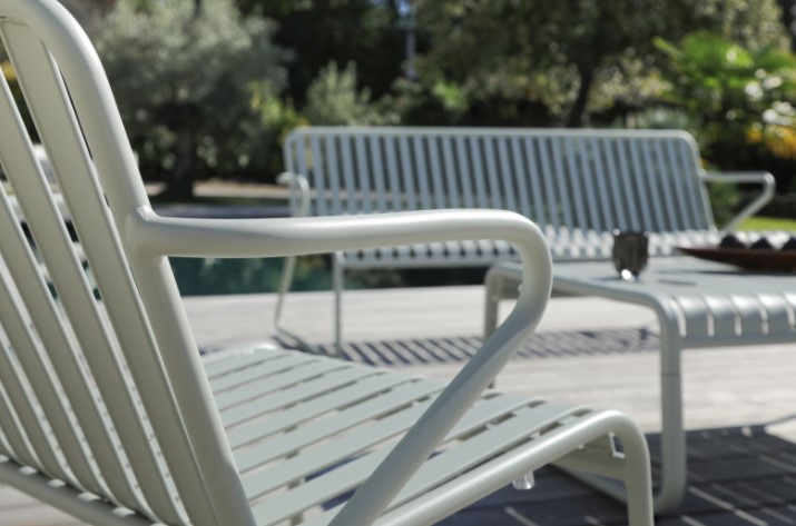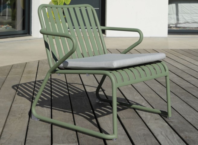 Powder coated aluminium Olefin fabric Rounded, curved backs with tapered legs, thick, deep cushions